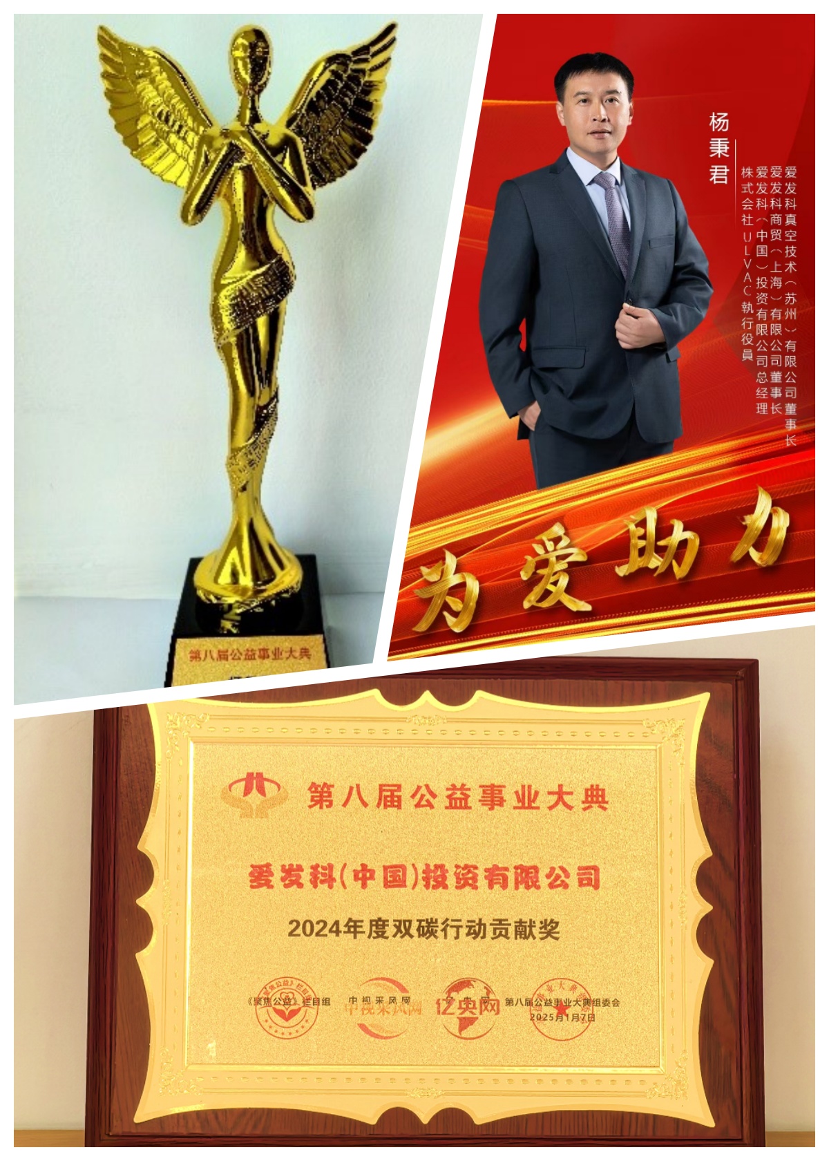 2025年1月7日,第八届公益事业大典在上海隆重举行。爱发科(中国)投资有限公司凭借在2024年社会贡献活动及可再生能源应用方面的显著成果,总经理杨秉君荣获“2024年度公益先锋人物奖”,公司则摘得“2024年度双碳行动贡献奖”桂冠。 2024年,爱发科中国集团整体共开展了135项活动,累计社会贡献时间约10,000小时。同时,7家公司完成了太阳能板安装及绿色电力采购,可再生能源使用率攀升至9.5%。 展望未来,将继续秉持爱发科集团的可持续发展经营方针,深入推进更广泛的ESG(环境、社会及治理)活动。我们诚挚期待您的持续支持与合作。